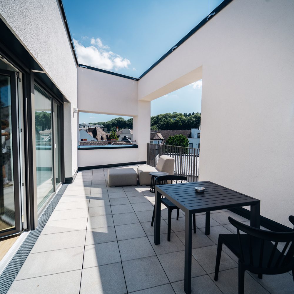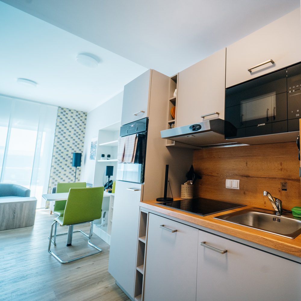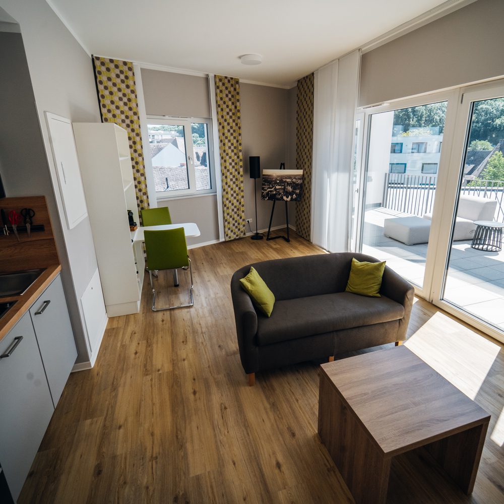 Die 27 Apartments mit 31 – 39 qm wurden für höchste Ansprüche konzipiert. Helligkeit und Farbgebung, großzügige Flächen und die stilvolle Einrichtung machen die Apartments zur ersten Wahl im Segment Wohnen auf Zeit. Die Terrasse und eine große Glasfront sorgen für viel natürliches Licht und Weitblick.