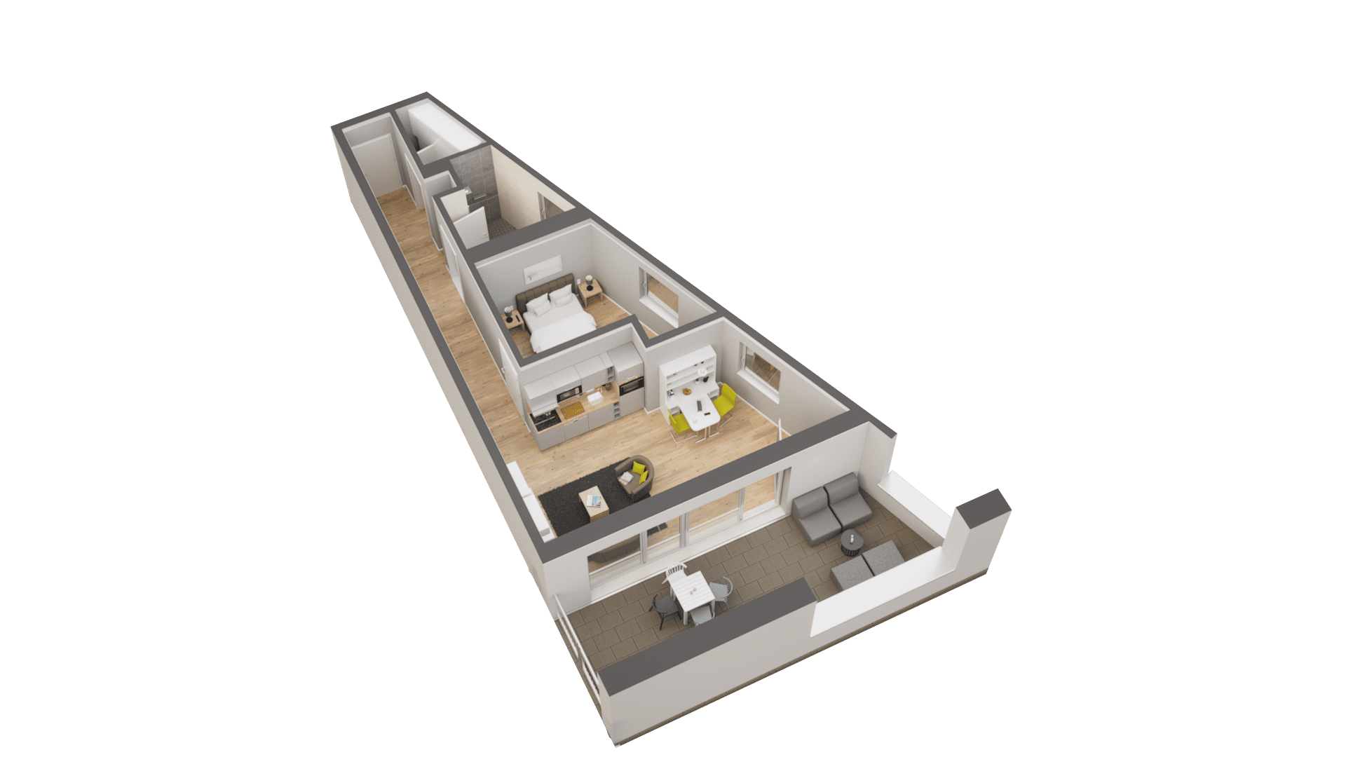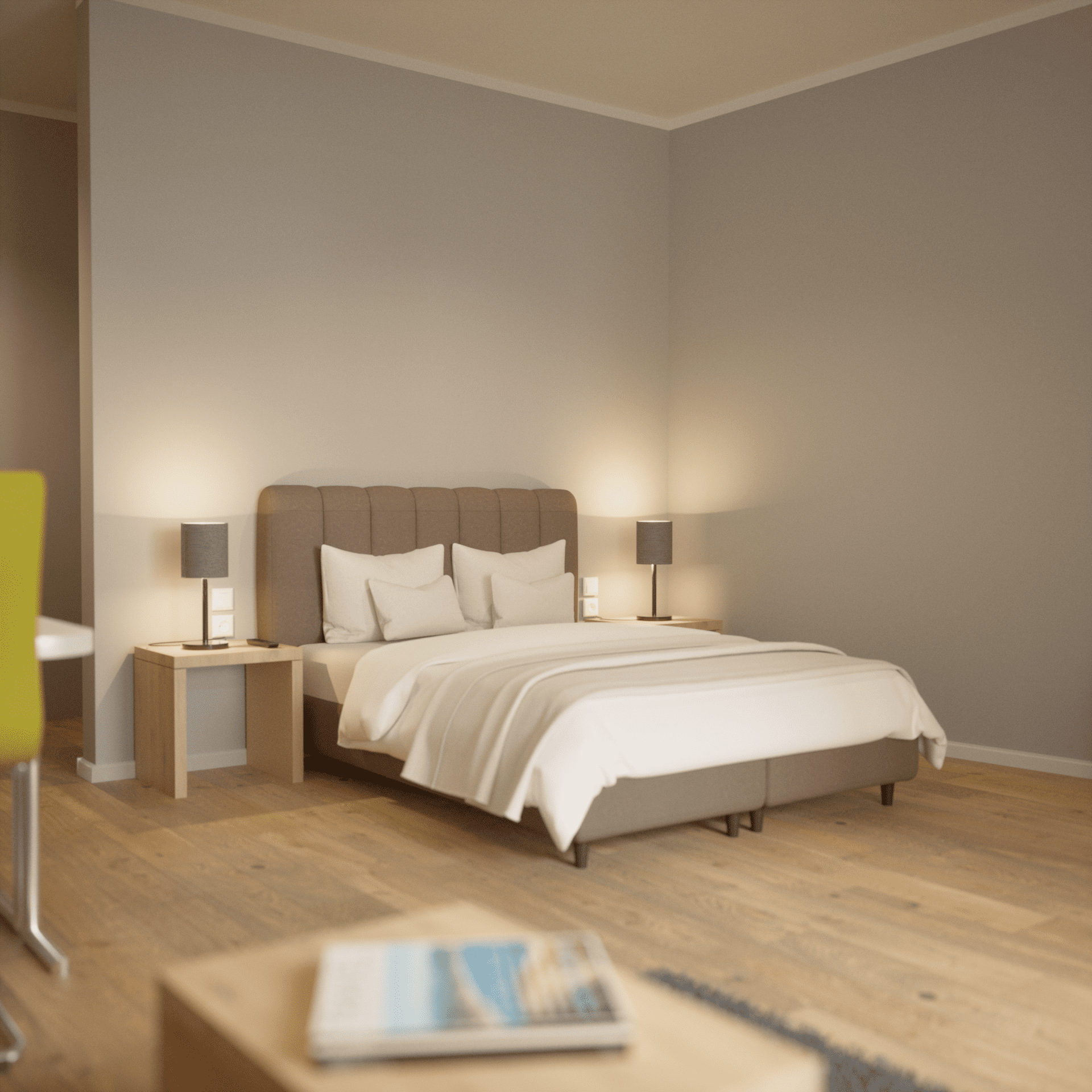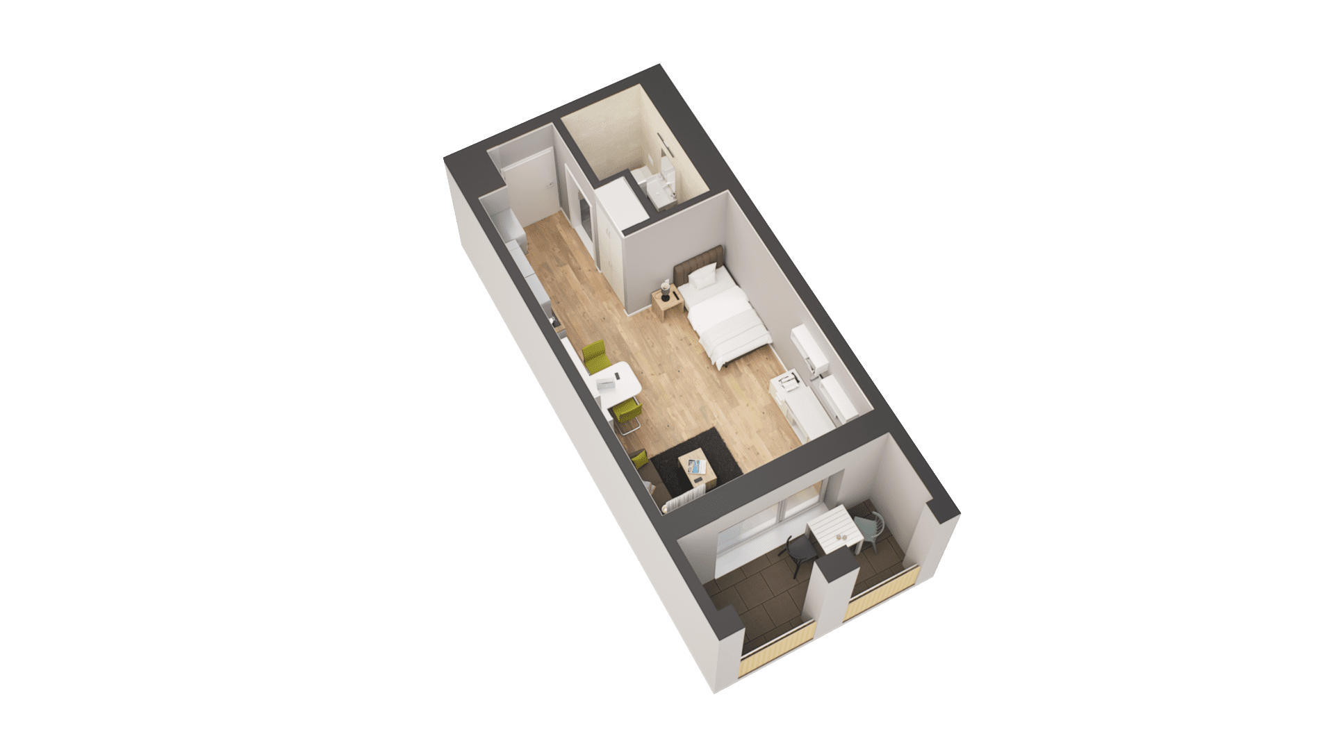 Die 27 Apartments mit 31 – 39 qm wurden für höchste Ansprüche konzipiert. Helligkeit und Farbgebung, großzügige Flächen und die stilvolle Einrichtung machen die Apartments zur ersten Wahl im Segment Wohnen auf Zeit. Die Terrasse und eine große Glasfront sorgen für viel natürliches Licht und Weitblick.